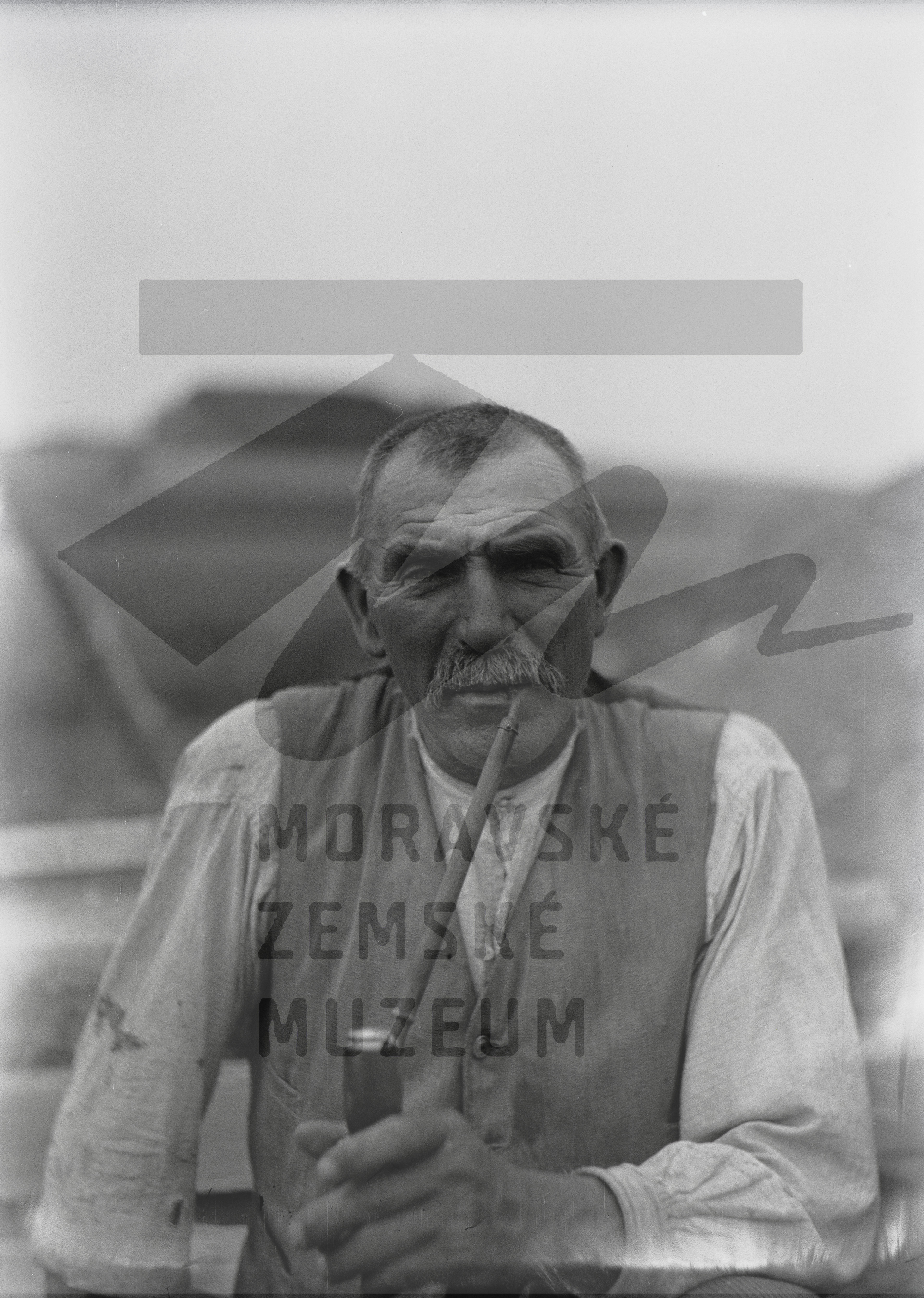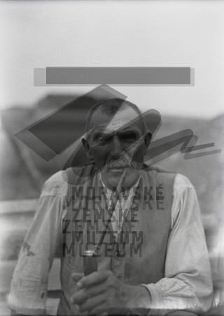 Portrét muže s dýmkou, nepopsáno. Podle informací od Ireny Přibylové snad Jan Přibyl, narozen roku 1882.