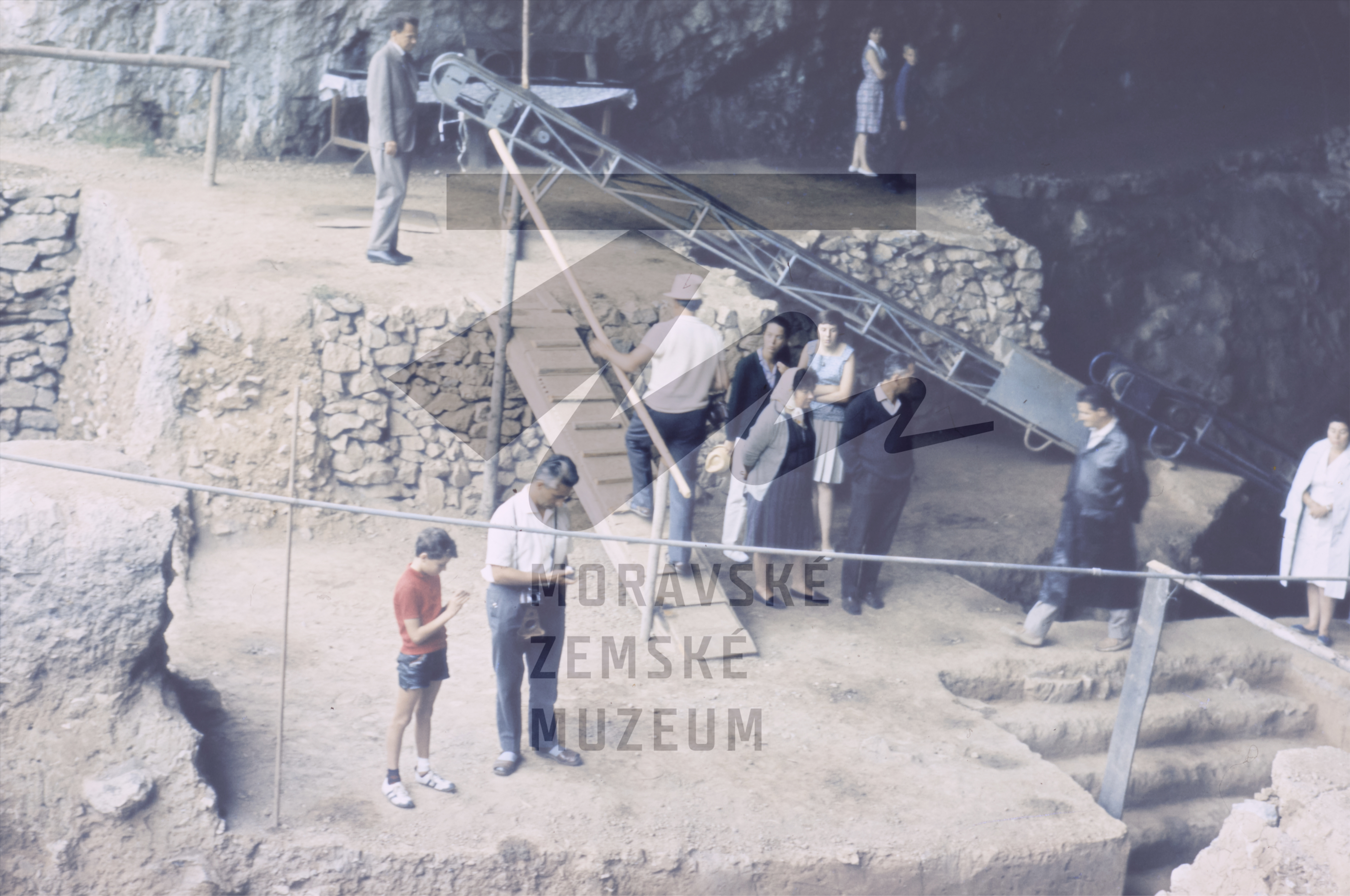 Kongres UISPP 1966 exkurze, nahoře K. Valoch (v šedém obleku), dole s bílým kloboukem R. Naugier. Sektor D, jižní vchod. Diapozitiv.
