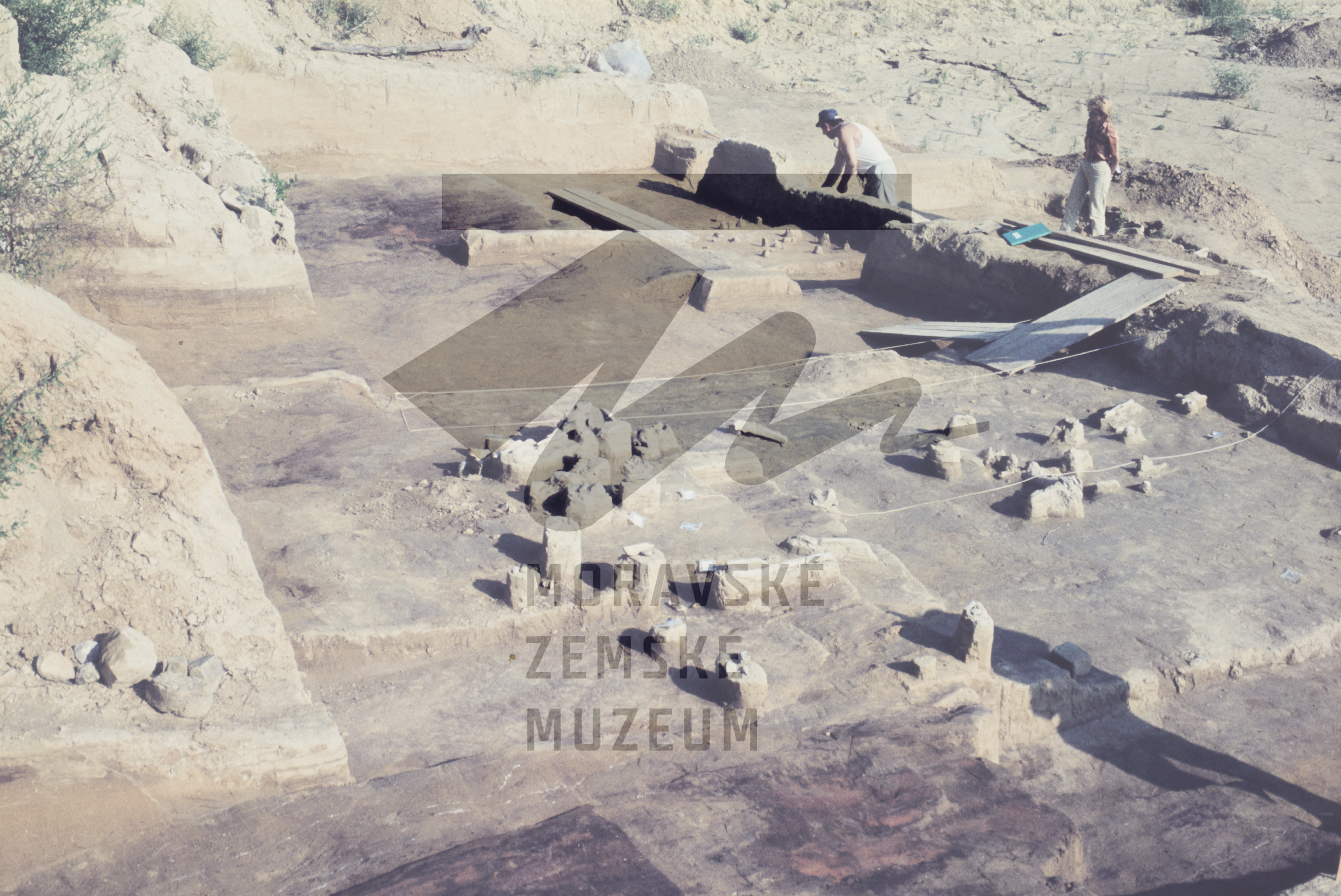 Preparování kulturní vrstvy. Tmavé plochy v popředí vpravo - ohnistě z horizontu aurignacienu.