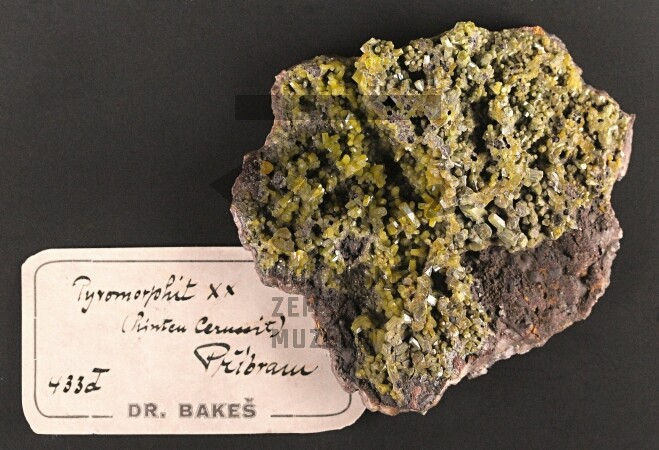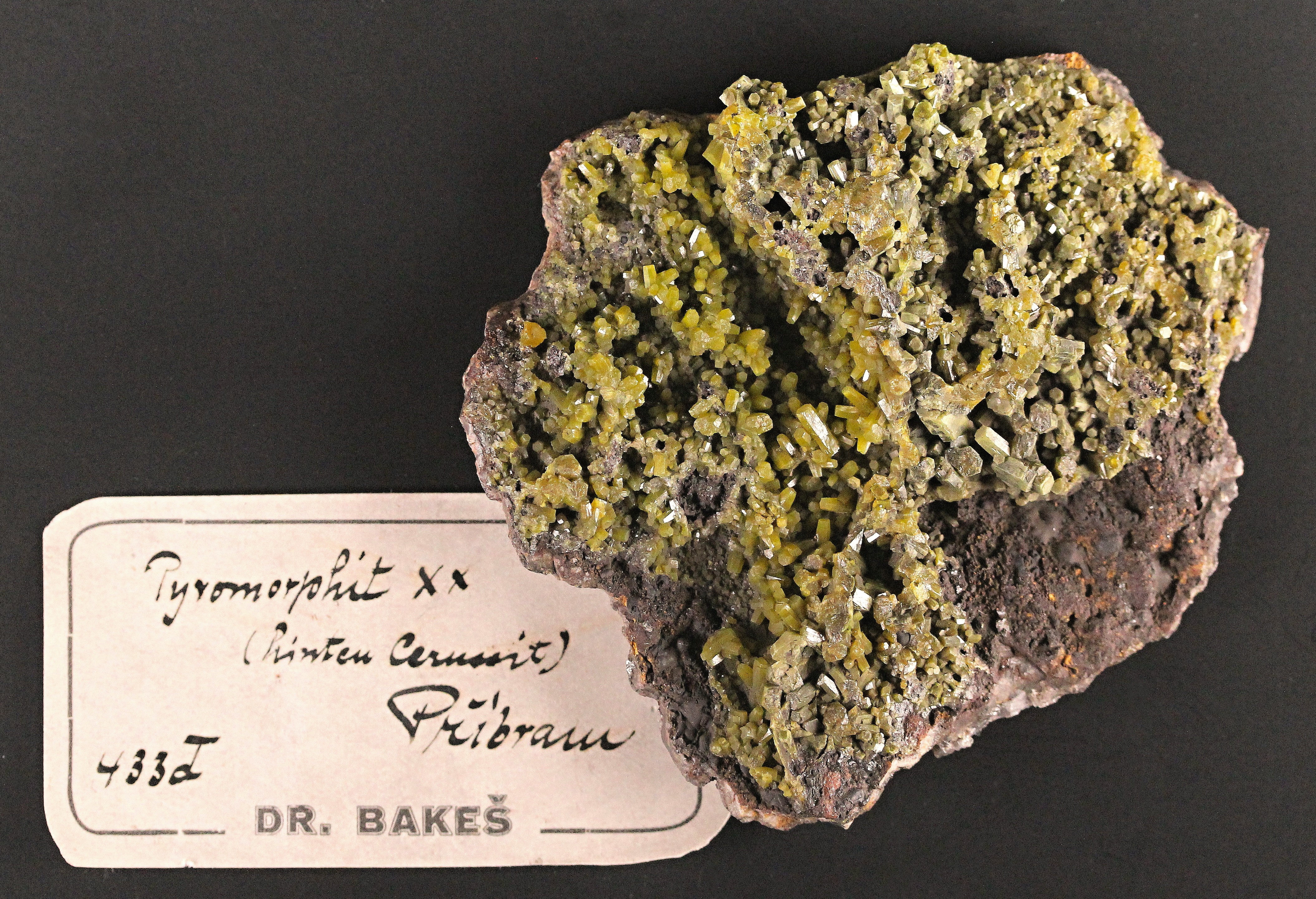 Historická etiketa Dr. J. Bakeše - pyromorfit, Příbram-ČR, velikost vzorku 6,5 x 6 cm, foto J. Toman